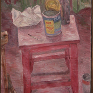 Кувшин, банка и спички на табурете. 1966. Х.,м., размеров нет.Неизвестная коллекция.